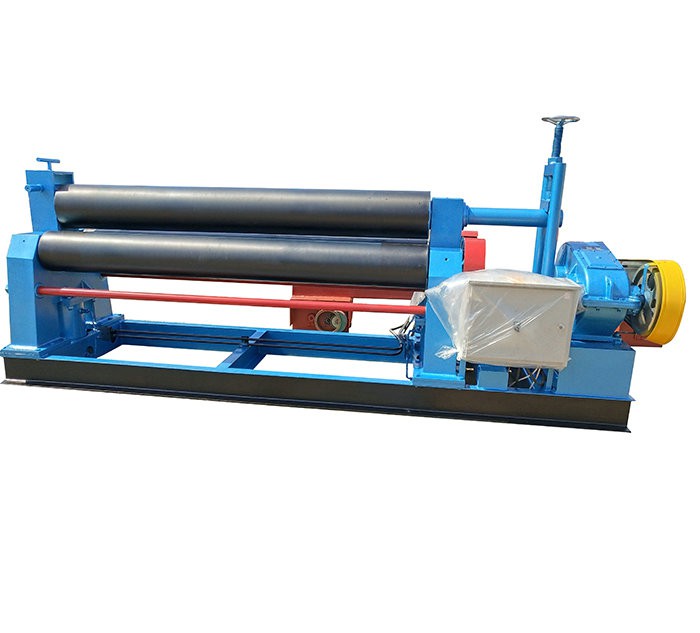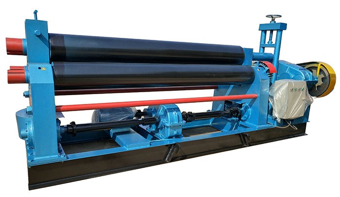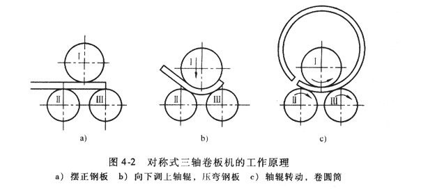 该机结构型式为三辊对称式,上辊在两下辊中间对称位置作垂直升降运动,通过丝杆丝母蜗杆传动而获得,两下辊作旋转运动,通过减速机的输出齿轮与下辊齿轮啮合,为卷制板材提供扭矩。